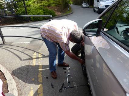 Nun denn, ärgerlich... aber es nützt nix. Die schöne Alufelge ist hinüber und auch der Reifen hat es hinter sich. Dabei haben wir in unserer Reisebewerbung noch mit unseren Erfahrungen mit dem Linksverkehr geprahlt. |