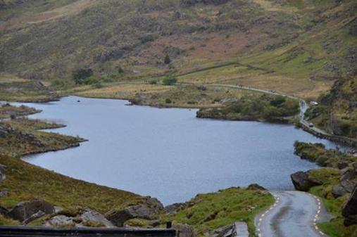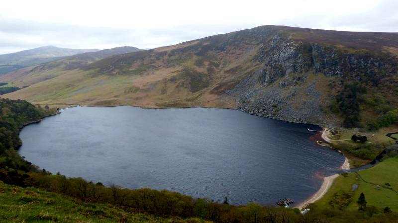 Bis wir startklar sind, ist es jedoch 11:30 Uhr. Wir fahren in Richtung Süden in die Wicklow Mountains. Leider meint es die Sonne heute nicht gut mit uns. Umso mehr wirkt die Heidelandschaft, die wir durchfahren, wie eine Mondlandschaft. Nichts mit „grüner Insel“. Die Vegetation ist noch braun, hier ist der Frühling noch nicht richtig angekommen. An mehreren Stellen hat es wohl gebrannt, einige Flächen sind schwarz vom Ruß. Trotzdem hat die weite Landschaft ihren eigenen Reiz – wir sind fasziniert. Unser erstes Zwischenziel ist der Pass Sally Gap. Von dort hat man eine fantastische Aussicht auf den kleinen im Tal liegenden See Lough Tay. Es ist stürmisch und kühl und wir werden ganz ordentlich durchgeschüttelt. Aber noch ist es trocken. |