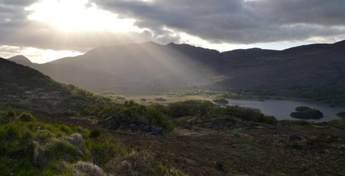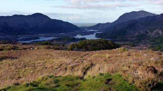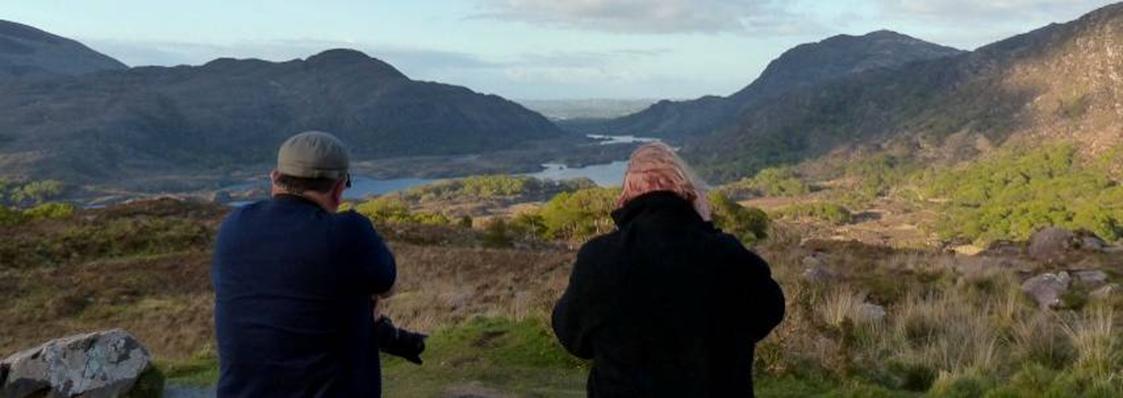 Zwischen Kenmore und Killarney wartet ein weiterer Höhepunkt: Der berühmte Ladies View im Killarney Nationalpark. Ein Aussichtspunkt, der einen wahnsinnig schönen Blick über das Tal und den Upper Lake bietet. Es ist wirklich beeindruckend. Wir haben Glück, die Sonne steht zwar schon tief, dennoch ist das Licht fantastisch für ein paar schöne Fotos. |