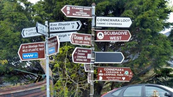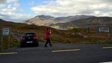 Wir beginnen die Tour mit einem Abstecher von Beaufort ins Tal von Dunloe. Da wir aber am Anfang des Tals die Verbotsschilder nicht gesehen haben, fahren wir mit dem Auto hinein. Eigentlich ist die Zufahrt nur für Anlieger und offizielle Fahrzeuge zulässig - deshalb ernten wir den ein oder anderen unfreundlichen Blick von den Pferdekutschenführern und wundern uns über den schlechten Fahrbahnbelag - was wir uns jedoch erst erklären können, als wir das Tal wieder verlassen... mit genauem Blick auf das Schild. Sorry |
