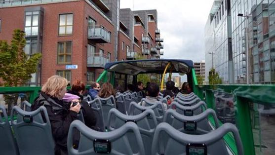 Gegen Mittag fahren wir weiter zum Phönix Park, einem riesigen grünen Parkgelände mitten in der Großstadt. Wir parken dort und steigen um in einen der grünen Doppeldeckerbusse für eine Stadtrundfahrt. Die Rundfahrt mit dem HopOn/HopOff-Doppeldeckerbus haben wir bereits in anderen Städten (London, Edinburgh, Glasgow) als sehr angenehme Art, sich einen Überblick über die Stadt zu verschaffen, genutzt. Auch hier bekommen wir viel zu sehen und interessante Informationen zu den einzelnen Sehenswürdigkeiten vom „Bordfunk“. Dublin ist eine Stadt der Kontraste: Neben der historischen Bausubstanz finden sich auch neue architektonische Attraktionen wie die Sean O’Casey Bridge, die Samuel Beckett Bridge und das neue Kongresszentrum (CCD). |